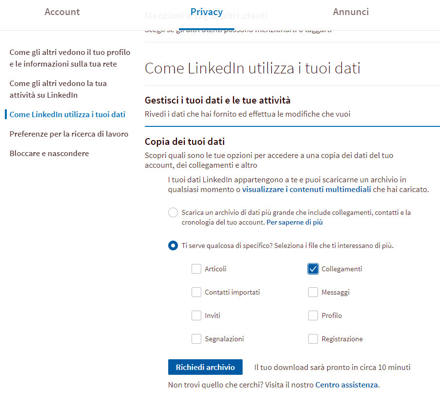 Linkedin ti chiederà per sicurezza la tua password e poi entro qualche minuto ti invierà una e-mail con l’url dove scaricare il file.
